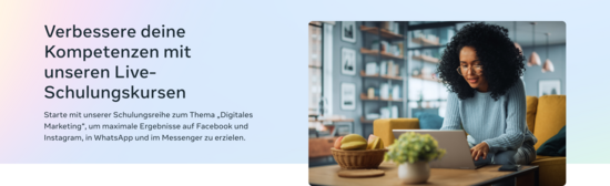 Lerne die neuesten Werbetools und -methoden mit Meta-Technologien kennen, die von einem oder einer erfahrenen Schulungsleiter*in im Rahmen eines Live-Schulungswebinars vorgestellt werden.