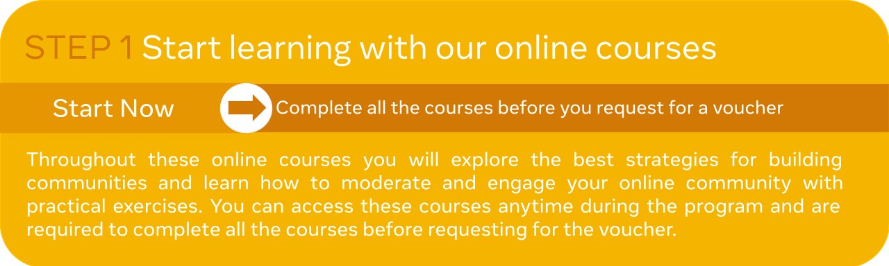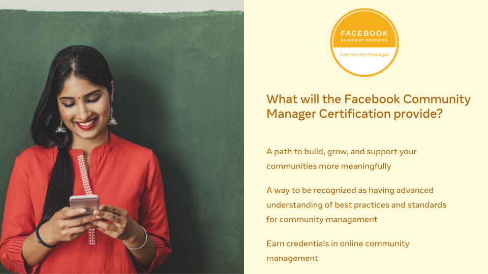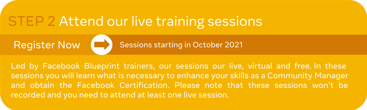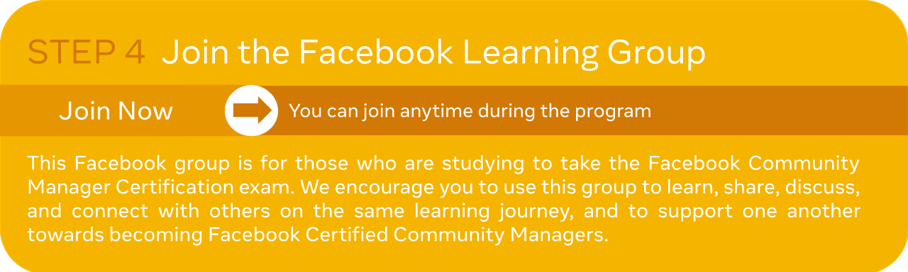 Additionally, those who successfully complete the program steps will receive a bonus voucher* to take the Facebook Certified Community Manager exam. Earning this certification will help demonstrate your expertise in online community management and add value to your resume.
